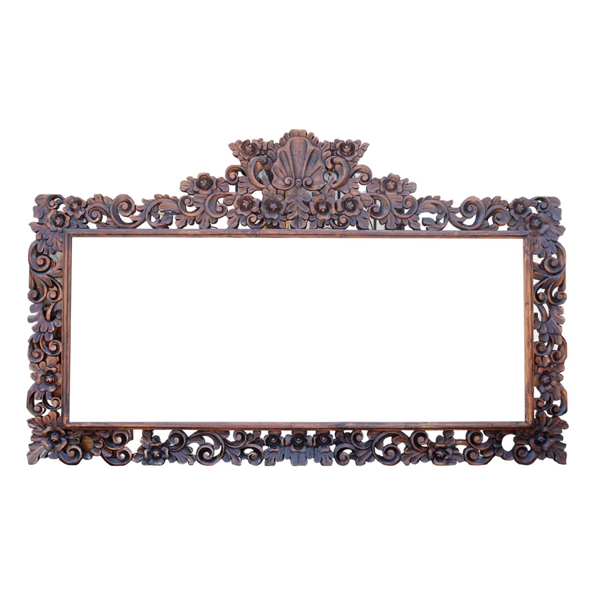 Marco de madera de pino, rectangular, con copete, talla resaltada. Acabados en hoja de oro/plata, así como en rustico con cera o al natural.